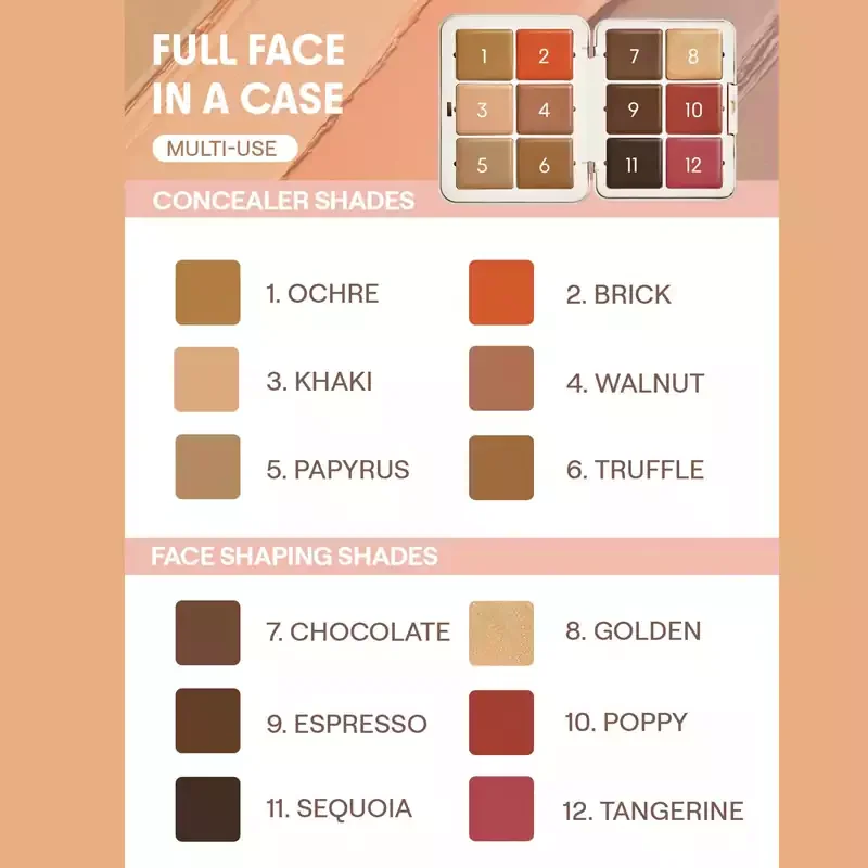 - Brick: کورکتور قرمز–نارنجی مخصوص پالت موکا که برای اصلاح تیرگیها، لکها و عیوب صورت در پوستهای سبزه با تهرنگ گرم استفاده میشود.