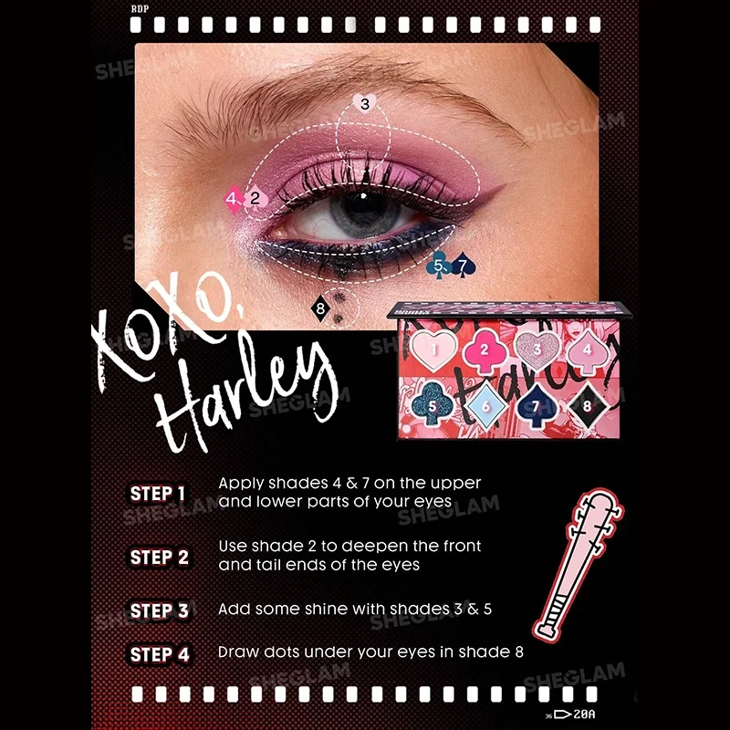 پالت سایه هارلی کویین با ۸ رنگ جذاب ارائه شده است که شامل ۶ رنگ مات 🖤 و ۲ رنگ شاین ✨ میباشد. این پالت برای انواع میکاپ فانتزی، روزانه و اسموکی ایدهآل است.