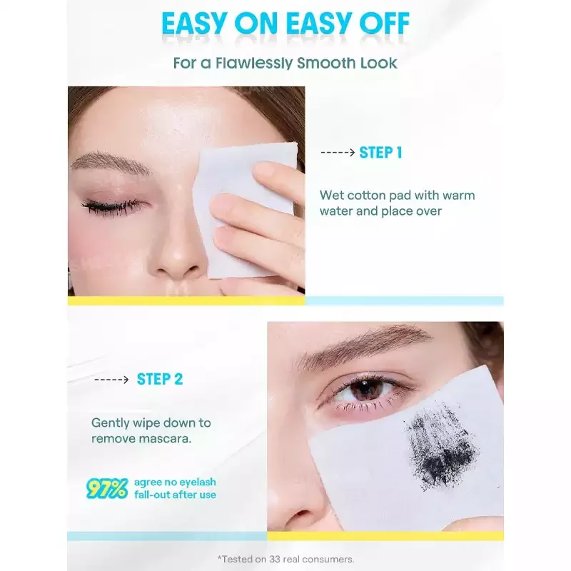 - پس از چند ثانیه، پد را به سمت پایین به نرمی بکشید تا لایههای تیوپی ریمل بهصورت کامل از روی مژهها جدا شوند.