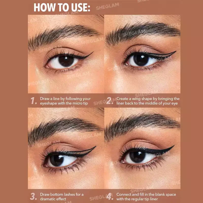 خط چشم ماژیکی دو سر Sheglam Multi-Tasker Line & Detail با طراحی حرفهای خود، امکان کشیدن خط چشم دقیق، متقارن و جذاب را حتی برای افراد مبتدی فراهم میکند. برای بهترین نتیجه، مراحل زیر را دنبال کنید: