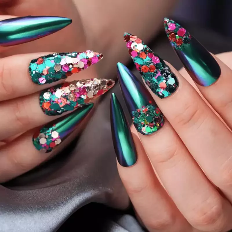 انتخاب کروم سبز فقط یک رنگ نیست، بلکه طرحی جذاب با انرژی مثبت، حس لوکس بودن و خلاقیت است. پودر کروم سبز کله غازی و سبز سلطنتی هر دو با داشتن شید رنگی عمیق جلوهای خاص و مدرن به استایل شما میدهند و در عین حال طراحی ناخن را پر از حس لوکس بودن، آرامش و انرژی مثبت خواهند کرد.