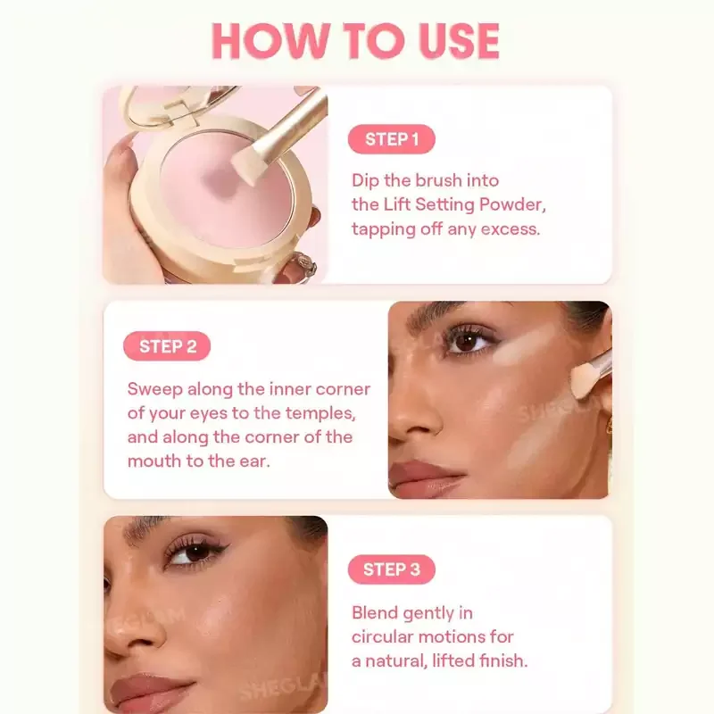 در پایان، با حرکات دایرهای و ملایم پودر را محو کنید تا جلوهای طبیعی، صاف و لیفتشده روی پوستتان ایجاد شود.